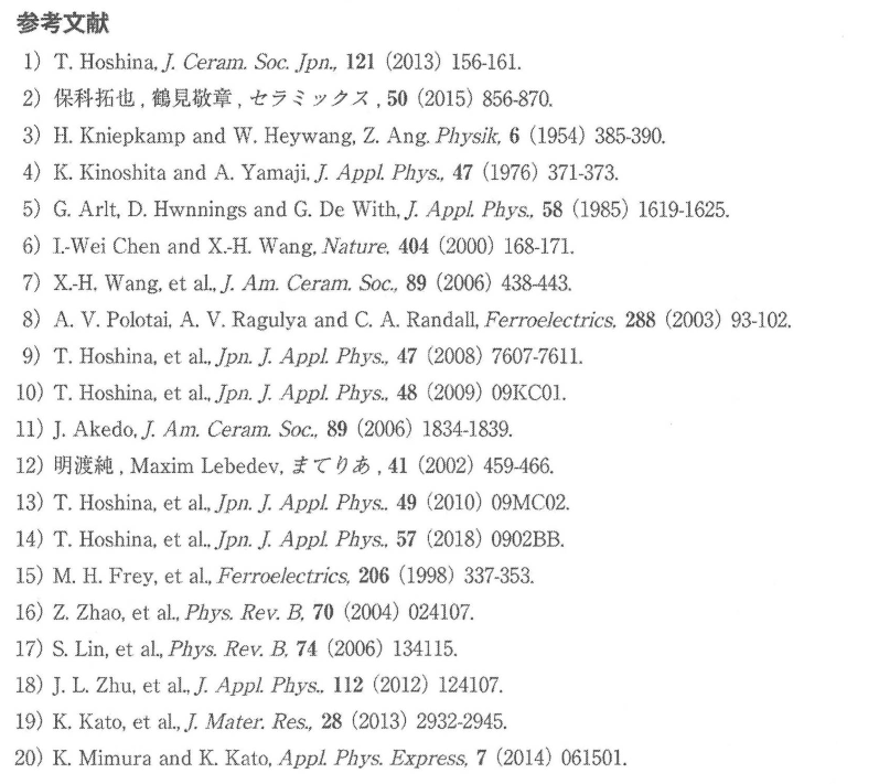 BaTiO3 세라믹스의 그레인 사이즈 효과는 도메인 벽 효과와 입계 효과가 중첩된 현상으로 해석된다. BaTiO3 세라믹스의 유전율 저하가 입계 응력에 의한 것이라면, 입계를 개질함으로써 유전율의 향상을 기대할 수 있다. MLCC의 유전체층에는 이미 코어-쉘 구조로 불리는 헤테로 구조를 갖는 재료가 사용되고 있는데, 특히 쉘에 사용하는 재료에 관해서는 사이즈 효과에 대응시켜 조성을 변성시켜야 할지도 모른다. 더불어 입자의 형상제어나 배향화에 의해 입계응력을 극한까지 줄이는 것이 가능할 수도 있다. Miura와 Kato등은 20nm 정도의 입방체형상의 BaTiO3 미립자를 사용하여 결정방위가 거의 완전히 갖추어진 나노입자집적체를 제작하였다. 또한 입경 20nm 정도의 나노입자집적체가 강유전성 히스토리시스를 그리고, 3,000정도의 비유전율을 갖는 것을 보고하였다. 나노입자화해도 강유전성이 상실되지 않고 고유전율을 유지한다는 그들의 결과는 매우 임팩트가 크다. "탈BaTiO3"가 좋은지, BaTiO3의 나노구조를 고도로 설계·제어하는 것이 좋은지, 그것을 파악하는 것이 매우 중요하다.