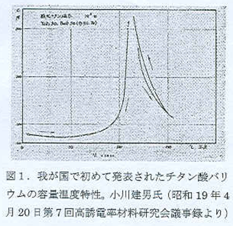 1943년 6월 12일, 도쿄 마루노우치 호텔에서 고유전율 재료 연구회가 니시카와 마사하루(도쿄대 물리), 니타 유우(오사카대 이학) 스이치 산이치로(도쿄대 화학), 코마가타 사쿠지(운통성) 오가와 타케오(운통성) 이하 19명으로 발족했습니다. 취지는 고유전율 재료의 개발과 이론적 기술적 여러 문제의 연구였으며 응용 목적은 고품질의 콘덴서용 유전체, 전계 조정용 유전체, 고주파 유전체였습니다. 오가와 씨로부터 빌린 자료에 의하면, 제5회 의사록(1947년 1월 20일)에서는 오가와 씨가 산화티타늄 자기의 전기적 특성을 보고해, TiO2 40%-MgO 28%-BaO 32%의 조성으로 ε 950으로 현격한 차이로 큰 유전율이 밝혀졌습니다. 이것에 대해서 오가와씨는 「본 소지는 반도체화되어 있다고 생각한다」라고 회의적으로 코멘트하고 있습니다. 공동연구자인 가즈쿠 시게루 씨의 나중 논문에 따르면 당시 순수에 가까운 조성일수록 환원하기 쉽고 다소 검은 빛이 도는 반도체가 돼 겉보기 유전율은 매우 커지기 일쑤였던 것 같습니다. 이듬해 제7회 의사록(쇼와 19년 4월 20일)에 따르면 오가와 씨는 산화티탄 자기의 전기 특성 제2보에서 TiO2 50%-BaO 50%에서는 ε 2000으로 더 크고, 110℃ 부근 유전율은 상온의 4~5배가 되어 온도에 대해 가역적으로 변화하고, Tan δ도 105℃ 부근에서 증대가 된다고 보고하여 유전율 온도 특성이 산모양 곡선이 되는 이유에 대해 논의했다고 합니다. 그림 1에 일본 최초로 보고된 티탄산바륨의 용량온도특성도를 나타내었다. 얼마지나지 않아 이는 락셸염, KDP에 이은 제3의 강유전체임이 확인되었습니다. 그 후 본토 공습이 시작되어 패전이 농후했던 1945년 5월 8일을 끝으로 연구회는 끝났습니다. 이러한 상세한 연구 회의 기록이 존재하는 것은 일본 유전체 연구의 귀중한 재산입니다. 이 강유전체는 지금까지와는 달리 습기에 강한 산화물 세라믹스이기도 해 물성 연구와 함께 응용 개발이 전후 얼마 지나지 않아 시작되었습니다.