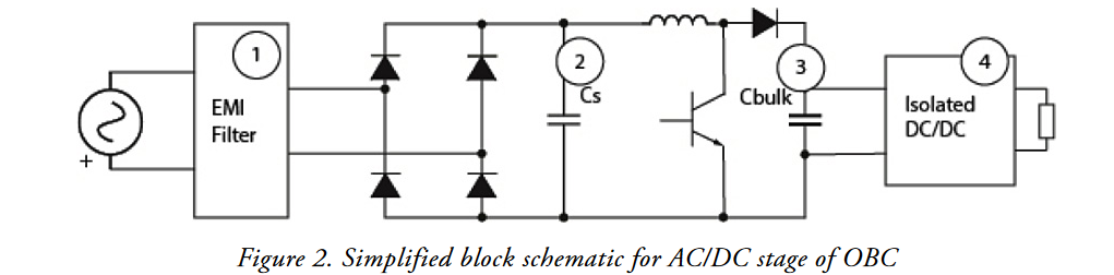 그림 2에서 트랙션 배터리 충전을 담당하는 온보드 충전기(OBC)를 살펴봅니다. OBC 내부에는 다음이 있습니다