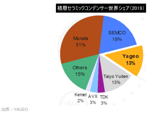 무라타 제작소나 태양유전, TDK등의 일본 업체의 점유율은 압도적이라고는 하지만, 업계에서의 야게오의 존재감이 증가하고 있는 것은 사실. 덧붙여 신뢰성이 요구되는 자동차용 적층 세라믹 콘덴서에 있어서는, YGEO는 아직 그 지위를 확립하지 못했다. 자동차용은 2021년 시점에서는 무라타와 TDK 등 일본 업체가 독무대이며, 한국 삼성도 거의 진입하지 못하고 있다. 그 삼성도 MLCC의 점유율 19%~21%로 높지만, 대부분이 자사 제품용, 특히 GALAXY 스마트폰용이 대부분.그렇기 때문에, 스마트폰의 매상이 줄어들면 상당히 점유율을 줄일 가능성이 있습니다. 삼성과 경쟁자인 중국 스마트폰 기업의 점유율이 증가하고 있기 때문에, 삼성이 줄인 물량을 야게오가 끌어들일 가능성이 있음.