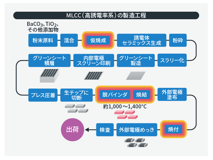 MLCC의 제조에는 사용되는 유전체 세라믹 재료 조성과 함께 소성 공정에서의 고도의 '미세 구조 제어 기술'이 요구됩니다.