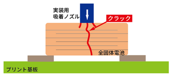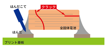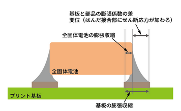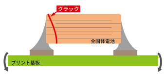 基板実装後の機械的ストレスの例(全固体電池本体へのストレス) 実装後の基板の分割、機器へのネジなどによる取付の際、落下衝撃等に基板がたわんだ場合、本体にクラックが発生する可