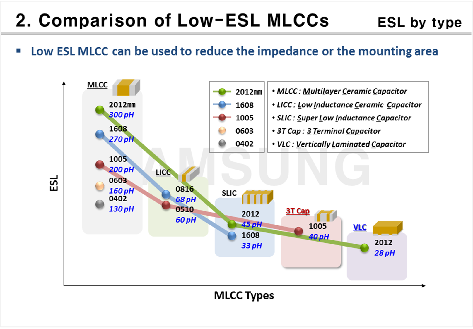 2. 방법 2: Low-ESL MLCC 사용: 예를 들어, 2012mm MLCC (300 pH) 대신 Low-ESL MLCC인 2012 VLC (45 pH)를 사용하여 임피던스를 줄일 수 있습니다.