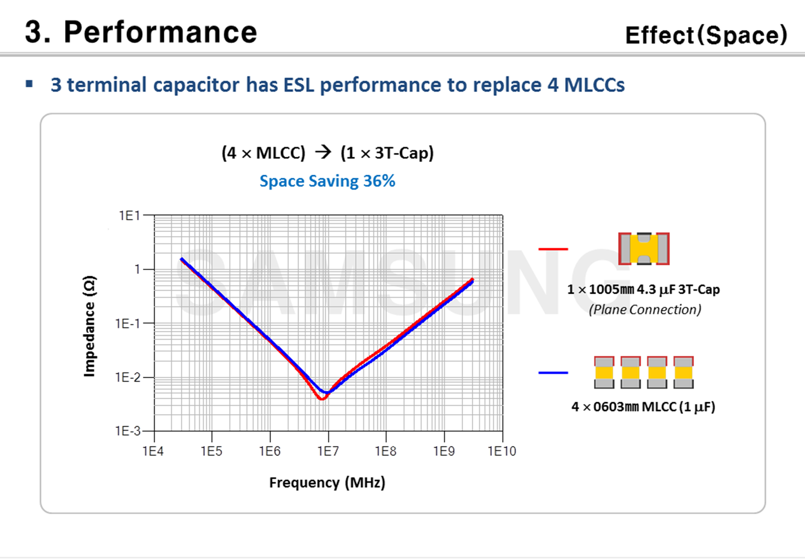 • MLCC (1 씩)를 3T Cap (4.3 )으로 대체할 경우, 유사한 임피던스 곡선을 유지하면서 36%의 공간 절약(Space Saving 36%) 효과를 얻을 수 있습니다.