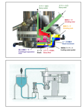 ◦ 강점: ****까지의 극소경 마이크로 비즈를 사용할 수 있어, 50 nm 목표 달성을 위한 최고의 분산 빈도를 확보할 수 있습니다. 작은 L/D 비율과 원심 분리 로터 구조는 비즈의 유출을 막고 샤프한 분쇄 에너지 분포를 제공하여 나노 분산 효율을 높입니다. (산화티타늄) 및 (티탄산바륨) 등 세라믹 분산에 대한 구체적인 실적이 있습니다.
