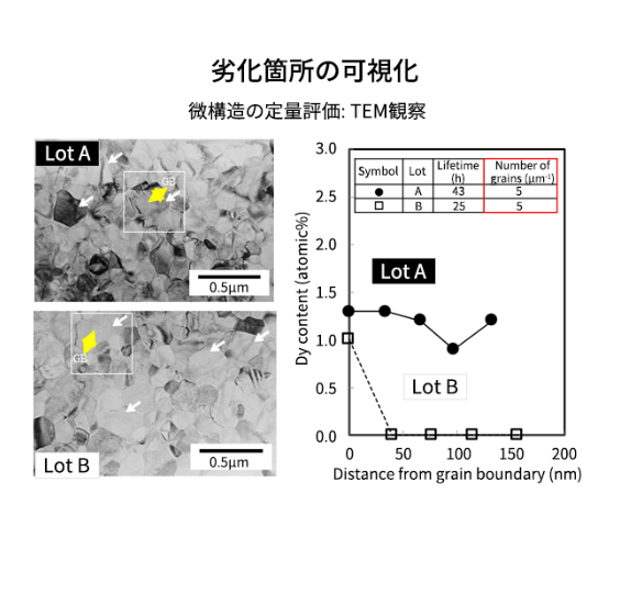 • 시사점: 이는 유전체 층 내의 최소 입자 수가 수명에 기여하는 것 외에도, 열화 위치의 조대 입자 내 희토류 원소(Dy)의 확산 고용 상태, 즉 셸(Shell) 상태의 차이도 수명에 영향을 미치는 요소임을 시사합니다.