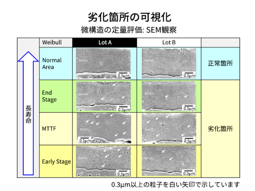 교세라는 소성 온도가 다른 두 종류의 MLCC(Lot A, Lot B)를 비교하여 소성 온도가 미세 구조에 변화를 가져오고 이것이 수명에 기여했다고 추정했습니다.