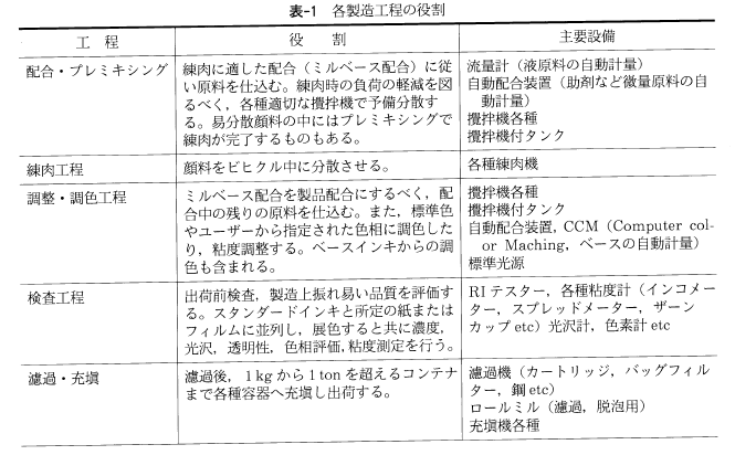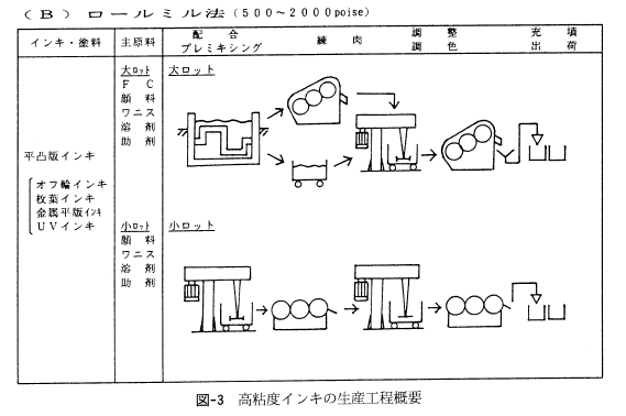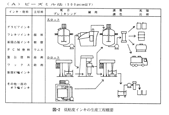 일반적인 잉크가 제조된 법은 이상과 깉지만 실제 생산 라인은 여러가지 고유기술을 살리고 품질에도 생산성에도 차이가 생긴다. 여러가지 제조법의 연구(생산기술)중에서 몇 가지를 소프트, 하드 양면에서 개설하고, 잉크 제조법과 생산기술 면에서 잉크품질과 생산효율과의 관계를 보고 싶다.