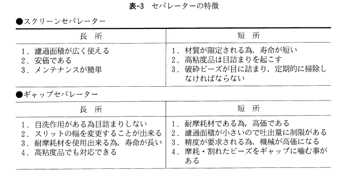 100리터의 베셀용기를 필요로 한 샌드밀이 15~20리터의 용기로 동등한 성능을 얻을 수 있을 정도가 되었다. 또한 각각의 세퍼레이터의 특징과 혼련기의 성격을 표3에 나타내었다.