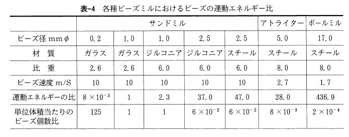 단위체적당 비즈개수는 직경비의 역수의 3승으로 많아진다. 예를 들어, 2.OmmΦ와 0.8mmΦ의 비즈의 단위체적당 비즈개수를 비교하면 약 16배나 된다. 그만큼, 충돌회수가 증가한다. 또, 같은 비즈경이라도 같은 운동을 한다면, 높은 비중의 비즈는 많은 에너지를 가지고, 충돌시의 힘은 강하다. (같은 입경의 유리비즈보다, 지르코니아비즈에서는 2~ 3배의 에너지를 가진다) 실제로는 취급난이도니 비즈 마모를 고려하여, 0.6~1.0mmΦ 비즈경이 많이 사용된다.