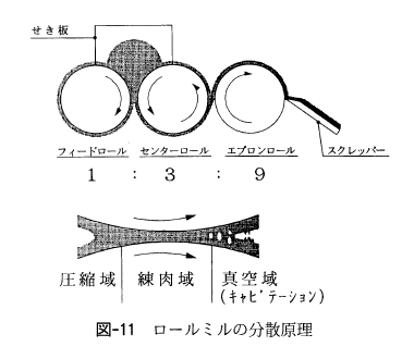 이상 비즈밀을 설명했지만, 전혀 분산기구가 다른 분산기로서 롤밀을 다루고 싶다.예로 부터 사용해 온 분산기로 기본적인 구조를 그림 11에 나타내었다. 3개의 롤이 각각 인접하는 롤과는 역방향으로, 게다가 다른 속도로(예 1:3:9) 회전하므로, 롤 접촉면에서는 큰 평형응력이 생긴다. 처리물은 좁은 롤 간극으로 이끌려, 이 큰 비틀림 응력을 받고, 접촉면 반대편에서 끌려감으로써 발생하는 캐비테이션을 통해 양호한 분산을 얻을 수 있다. 또한, 고점도 잉크에 있어서 어려운 여과, 탈포도 가능하다. 이 밖에 비교적 물갈이가 쉽고 소량생산도 어렵지 않게 해 주는 등 기동성도 있다.이러한 이유로부터, 특히 평판 잉크의 생산에서는 현재도 주력 기종이다.