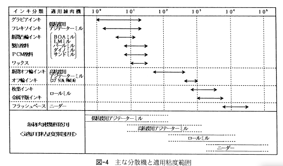 분산에 사용되는 밀을, 잉크의 점도 범위에 의해 분류한 것이 그림4이다. 또, 이러한 제조법 중에서도 생산효율을 높히고, 생산로트의 크기에 따라서도,
