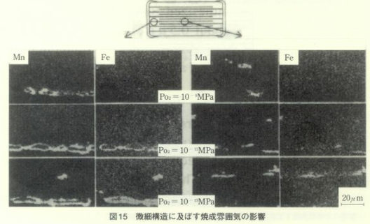 annealing시의 산소 분압은 동일하므로 Mn의 산화, 석출 또는 Fe, Ni의 산화 확산은 소성 시의 산소 분압에 의존하지 않는다고 예상된다. 그러나 실제로는 소성 시의 산소 분압에 따라 큐리온도가 변화하며, Mn의 산화 석출등의 거동이 소성 산소분압에 의존하고 있다.