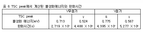 다음에 해석결과를 소개하였다. 그림26에 Y2O3를 첨가한 시료와 첨가하지 않은 시료에 대해 TSC법에 의해 측정한 결과를 나타내었다. 또 TSC피크에서 계산된 활성화에너지와 완화시간을 표6에 나타내었다.