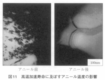 annealing에 있어서 미세구조의 변화를 투과형 전자현미경으로 관찰하여 상세히 조사한 결과를 그림11에 나타내었다. annealing 처리를 행하지 않은 시료에는 무수한 전위루프가 확인되었다. 이에 반해 annealing후의 시료는 이러한 전위루프는 전혀 확인되지 않았다. 전위루프는 산소공공의 집합에 의해 생성된다고 생각되어지며 annealing처리를 하지 않은 시료에서는 다량의 산소공공이 생성되어 있다고 추측할 수 있다.