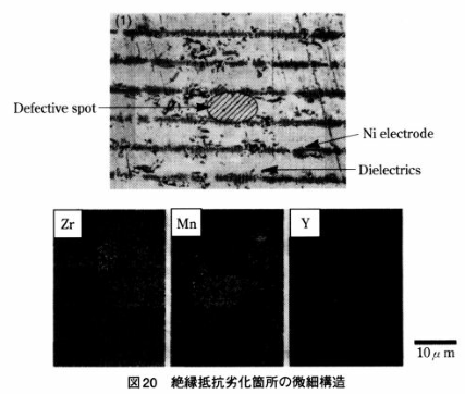 입계의 3중점에는 SiO2, BaO, 및 CaO가 풍부하며, 이에 대해 입계 근방은 BaO 및 CaO가 부족한 조성으로 되어 있는 것을 알 수 있다. 결정입내부에서는 A/B가 1보다도 크며, 주성분은 거의 배합조성과 같았다. 소결 조제로서 첨가된 SiO2는 입계 또는 3중점에 존재하지만 인접하는 (Ba1-xCaxO)m (Ti1-yZryO2) 와 반응하여 BaO 또는 CaO를 선택적으로 잡아 당긴다고 해석된다. 유전체에 내환원성을 부여하는 데에는 A/B를 1보다 크게 하는 것이 필수적이므로 저 산소 분압 소성시에 입계 근방에서는 부분적인 환원을 받을 가능성이 있다고 지적되었다. 즉, 가속 시험시에 우선적으로 열화가 진행되고, 콘덴서의 가속수명을 짧게 한다고 생각된다. 이는 입계 모델을 지지하는 것이다.