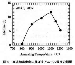 고온 가속수명에 미치는 annealing 온도의 영향을 그림8에 나타내었다. 그린 칩을 1340℃, PO2 = 10-13 MPa로 소성한 후에 재산화를 목적으로 annealing를 행하였다. annealing의 분위기는 PO2 = 10-6 MPa이다. annealing를 실시하지 않는 경우에는 수명은 0시간이며, 1100℃에서 annealing를 한 경우에는 가장 길다는 것을 알 수 있다. annealing 온도가 낮은 경우에 수명이 짧다는 것은 재산화가 불충분한 것이 기인한다.