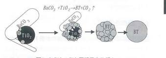 고상 법으로 통한 BT의 생성은 그림 4에 나타낸 것과 같이, 산화티탄과 탄산바륨의 접점에서 일어난다. 접점에서 탄산바륨이 분해됨과 동시에 Ba2+이온이 산화티탄으로 확산되어, 반응이 진행된다고 생각된다. 그래서, 합성된 BT 입자의 사이즈는 산화티탄 입자의 사이즈에 크게 의존을 하고 있다. 그리고, 결정성은 이 성장과 함께 커지는 경향이 있다. 따라서 소정의 입자 사이즈로 고 결정 BT를 얻으려 할 경우, 산화티탄의 사이즈는 적어도 목표로 한 BT 입경의 몇 분의 1 이하의 미세한 입자를 사용할 필요가 있다. 반면, 탄산바륨은 확산 중(擴散種)이므로, 산화티탄과 같은 제약은 없지만, 균일한 BT 입자를 합성한다고 하는 관점에서는 산화티탄의 입자경에 가까운 사이즈의 탄산바륨을 사용하는 것이 바람직할 것이다. 미세한 산화티탄과 탄산바륨을 균일하게 분산하는 것으로 접촉 확률을 높일 수 있으며, 보다 균일한 반응을 진행시키는 것이 가능해진다.