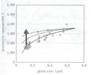 그림 3 티탄산 바륨의 입자 경과 유전율과의 관계