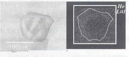 그림 9에는 c/a가 높은 100nm의 BT를 사용했을 경우의 미세구조의 TEM 사진과 대표적은 첨가성분인 Ho의 멥핑을 실시하였다. TEM 관찰 결과로 입자 내부에 강유 전층의 도메인이 관찰되었다. 그리고, 원소 멥핑의 결과로, 쉘 측에 Ho이 많이 확산되어 있다는 것을 알 수 있었다. 이러한 내용을 바탕으로 100nm의 입자에서도 코의 쉘 구조를 형성하고 있다는 것을 알 수 있었다.