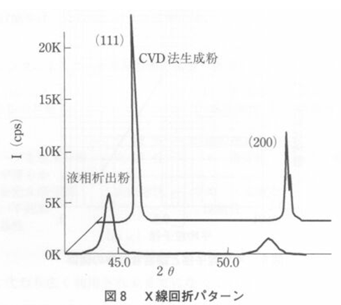 CVD법과 일반적인 액상법으로 업더진 니켈 초미분의 결정성을 분말 x선회절법 파단으로 비교한 것이 그림 8이다. CVD법의 회절 파단의 방향이 SHARP하고 결정성이 높은 것을 알수 있다. Warren -Averbach법으로 결정자크기를 해석하면 액상법에서는 약 0.02㎛정도로 작다. 한편 CVD법으로는 약 0.1 ㎛이상이고 결정자 SIZE가 크며 그것은 사진2의 투과형 전자현미경으로 관찰되며 CVD법의 입자는 단결정이며 쌍정을 가진 결정성이 높은 입자로 되어 있다.