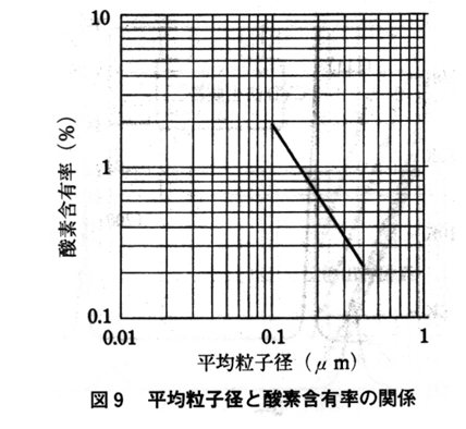 그림9에는 평균입자크기와 산소함유율의 관계를 표여주고 있지만 그 결과로부터 계산된 산화막 두께는 어느 입자크기에도 수 nm정도 거의 일정하게 유사하다.
