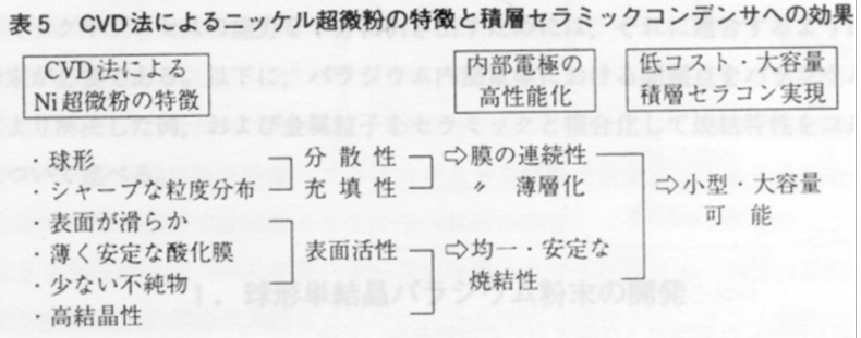 CVD법의 니켈 초미분에는 이상의 특징이 있기 때문에 표5처럼 MLCCC의 내부전극을 보다 얇게하고 보다 많게 적층하기 위해 현재는 범용적으로 사용하여지는 것처럼 되어 있다. 현재 이 방법으로 월 수십톤까지 생산되어지며 MLCCC의 내부전극재로서 은-팔라듐을 대체하여 이용되어지고 있다.