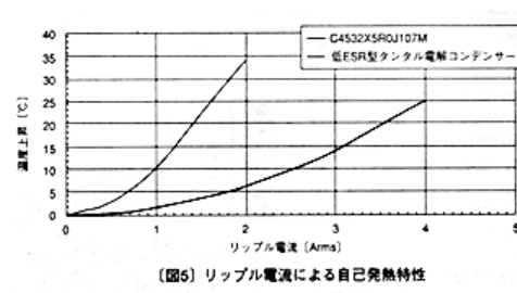 그림 5에 리플 전류에 대한 콘덴서의 자기 발열 특성을 하다. X5R특성 제품은 탄탈 전해 콘덴서에 비해서 니켈 내부 전극의 사용에 의한 고주파 대역의 ESR이 낮아 리플 전류에 의한 자기 발열을 많이 줄인다. 그래서 리플 전류에 대한 신뢰성이 높은 스위칭 전원부의 평활용 콘덴서에 적합하다.자기 가열 온도 상승이 20℃에서 비교하면 저 ESR형 탄탈 전해 콘덴서가 약 1.4Arms인 반면 본 개발 C4532X5RJ107M에서는 약 3.6Arms라고 하는 약 2.5배의 허용 전류이다.