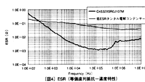 임피던스-주파수 특성을 그림 3에 ESR-주파수 특성을 그림 4에 나타낸다. 적층 세라믹 콘덴서에서는 내부 전극 재료로 사용되어 온 팔라듐을 저항이 작은 니켈로 바꾸고 소형화, 다층화로 ESR(등가 직렬 저항)저감화가 도모되어 왔다. 그래서 X5R특성 제품은 저 ESR형 탄탈 전해 콘덴서에 비해 ESR이 약 한 자릿수로 낮고 고주파 대역에서의 윤활 성능에 뛰어나다.