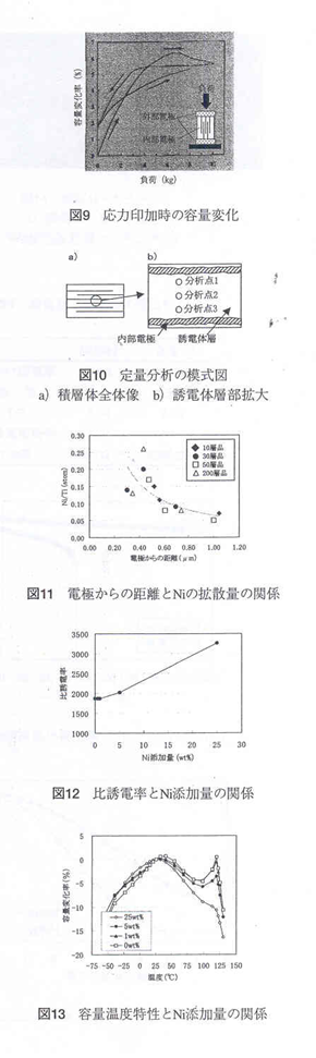 이상과 같이, 다층화에 있어서 전기특성의 변화는 내부전극 Ni에 의한 압축응력이 주요인으로 생각된다. 한편, 내부전극 Ni은 세라믹스에 확산하여, 그 전기특성을 변화시킨다. 또한, Ni의 확산량이 변화하기 때문에, Ni확산량 (고용량)의 변화에 의한 전기특성의 변화를 가져 온다.