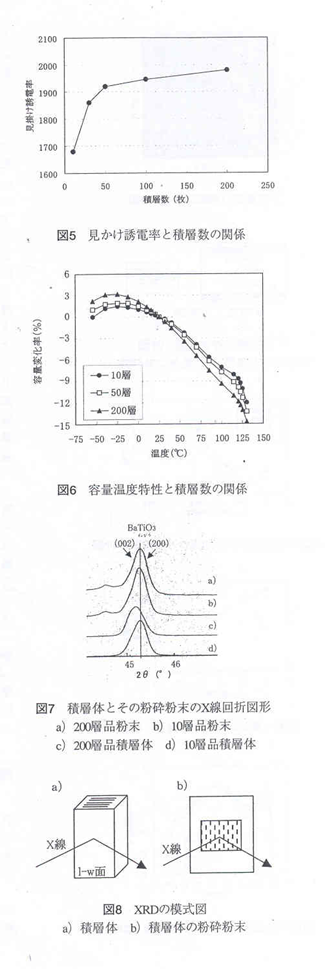 또한, 본 건과 마찬가지로 겉보기 유전율의 증가가 50-100층 정도에서 포화하는 현상은 다른 재료에 있어서도 보여진다. 이 원인으로서는 내부전극으로부터의 압축응력이나 Ni의 확산량이라고 하는 외적요인 자체가 포화하는 것과, 외적요인에 대한 유전체 재료의 특성변화 자체가 포화하는 것이 생각되어 진다 (예를 들면, 그림 9).