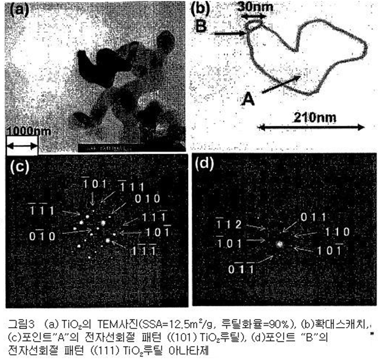 그림2에 비표면적23m2/g, 루틸화율70%인 TiO2의 SEM사진을 실었다. 또 TEM관찰의 결과를 그림3에 나타냈다. 그림3의 (a)에 나타난 입자 일부를 확대해 알기쉽게 스케치한 것이 그림3(b)이다. 큰 입자의 A점의 전자선회절 패턴이 그림3(c), 작은 입자 B점의 전자선회절 패턴이 그림3(d)에 나타나 있다.