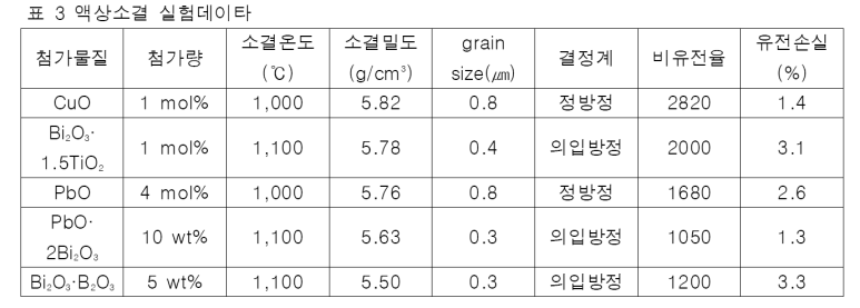 표 3은 수열법 BaTiO3에 각종 용제를 첨가해서 소결시킨 세라믹스의 특성을 비교한 자료이다. 본 표에 의하면 Bi2O3의 첨가에 의해 1100℃에서 소결해서 擬입방정 구조의 세라믹스가 된다. CuO와 PbO는 Bi2O3 보다도 저온인 1000℃에서 소결하지만 정방정 구조의 세라믹스가 된다. 용제에 의한 소결에도 Bi2O3 는 소결과정에서 BaTiO3의 grain 성장을 억제해서 擬입방정 구조의 세라믹스가 된다. 이러한 擬입방정 구조의 세라믹스는 상유전체이므로 압전성이 없는 것과 DC 바이어스 특성이 우수한(DC 바이어스에 의한 정전용량의 열화가 적음) 콘덴서가 되기 때문에 박층고압용 MLCC에 적절하다. 한편, CuO와 PbO에서는 grain 성장을 조장해서 정방정 구조(강유전체)의 세라믹스가 됨을 알 수 있다. 이러한 차이는 융제(flux)에 기인한 소결 메카니즘의 차에 의한 것으로 여겨진다. 본 BaTiO3의 또 다른 하나의 큰 특징은 유전손실이 낮은 점이다. 수열법 BaTiO3은 앞에서 말한 바와 같이 결정질이 높으면서, 저자들의 자료에 의하면 그림 5에 나타낸 바와 같이 tetragonality 성이 풍부하고, 이 것이 저 유전손실성에 기여한다고 사료된다.