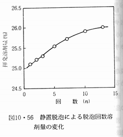 그림 10.56은 탈포하면 슬러리중의 용제량이 어떻게 변하는가를 나타내고 있다. 이 그림에서 처럼 탈포하면 용제량이 감소하기 때문에 슬러리 점도가 상승한다. 고로 Green Sheet 의 Casting두께가 변동된다. 또 혼합용제를 사용할 경우에는 조성이 변하기 때문에 Green Sheet 의 건조 크랙의 원인이 된다. 탈포는 Green Sheet의 품질안정화를 목적으로 하고 있으나 그외에 Casting공정을 위한 슬러리 의 점도조절도 겸하고 있다. 따라서 적정한 탈포조건을 파악하고 충분히 관리하는 것이 중요하다.
