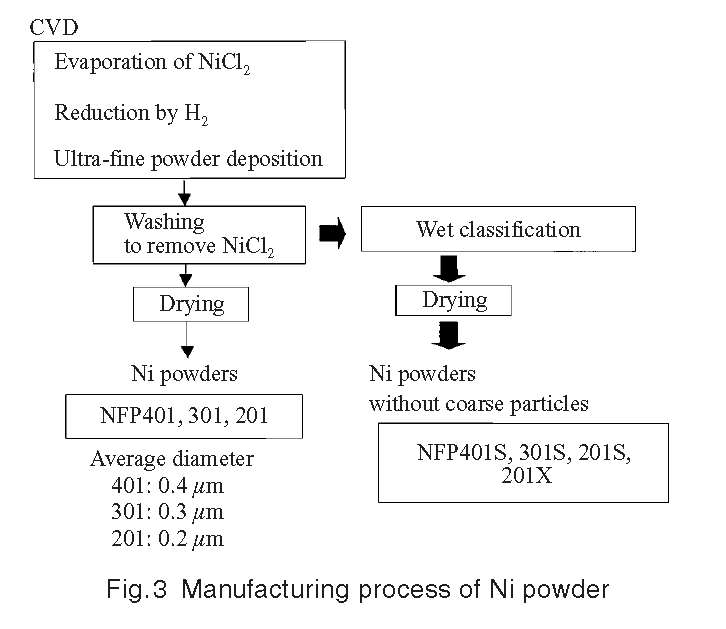 CVD 공정 후 3μm 이상의 조대 입자가 분급에 의해 제거된 NFP201S, NFP301S, NFP401S는 MLCC 내부 전극용 니켈 초미세 분말로 시장에서 인기가 높다. 특히 NFP201S는 1μm 이상의 조대 입자를 덜 함유하고 있어 정전용량이 큰 소형 사이즈 MLCC를 양산하기 위한 전극 소재로서 수요가 급증하고 있다. JFE미네랄의 대량 생산 및 분급 공정에서는 니켈 초미세분말의 조대 입자 비율과 표면 산화층 두께를 엄격하게 제어해 정전용량이 큰 소형 사이즈 MLCC용 분말 사용 시 높은 신뢰성을 보장한다. 이에 따라 JFE미네랄은 MLCC 고성능 제품(3μm 이하)용 니켈 초미세 분말 시장의 90%를 점유했다. 0.8μm 이상의 조대 입자가 제거된 NFP201X는 적층두께 1μm 이하의 고용량 소형 사이즈 MLCC에 효과적인 전극재로서 양산라인에 진입하였다.