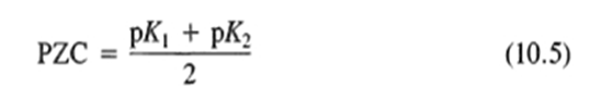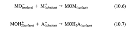 여기서, M은 Ba2+, Al3+, Si4+, Ti4+, Zr4+ 등과 같은 표면의 금속 이온을 나타낸다. 각 M은 결합 요구를 만족시키기 위하여 내부의 산소 이온과 역시 결합되어 있다. 표면의 영 전하점 PZC (point of zero charge) 는 반응식 (10.3)과 (10.4)의 pK 들의 항으로 정의된다.