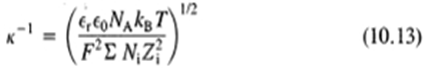여기서 κ^-1 은 하전된 표면으로부터 Ψ = Ψ0 / 2.718 인 면까지의 거리이며, 전기이중층 두께라고 부른다. 이중층 두께는 다음 식으로부터 계산된다.