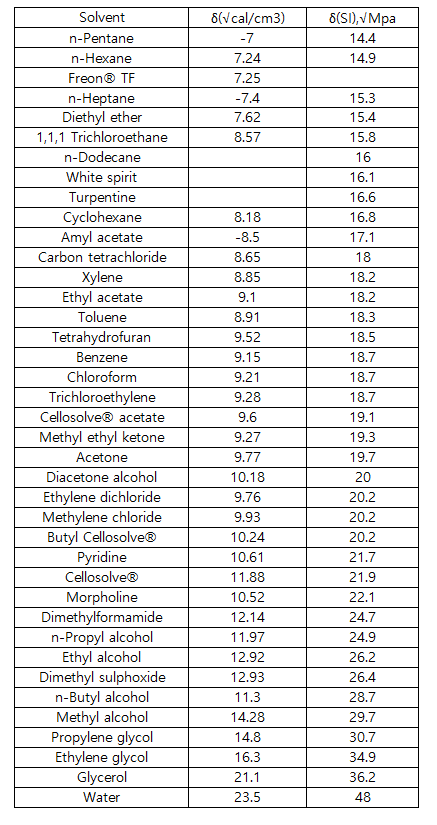 Standard Hildebrand values from Hansen, Journal of Paint Technology Vol. 39, No. 505, Feb 1967