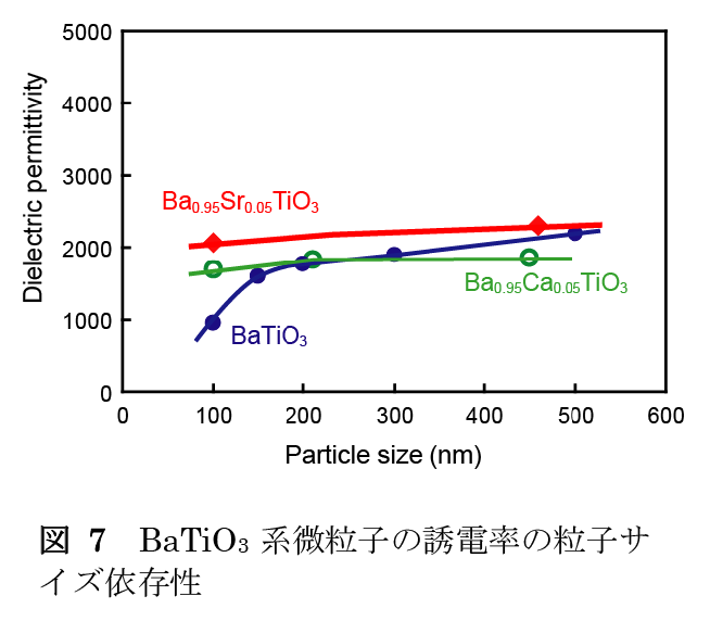 순수한 BaTiO3에 더해 티탄산바륨 스트론튬(BaxSr1-xTiO3), 티탄산바륨칼슘(BaxCa1-xTiO3)에 대해서 입자 구조 및 유전율의 검토를 시도했다. 그림 7은 BaTiO3, Ba0.95Sr0.05)에 대한 유전율의 입자사이즈 의존성이다.