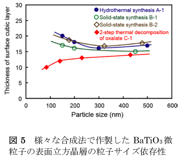 한편, 결정 내부에 결함이 적은 B-1이나 C-1에서는 c/a비의 값은 입자 크기에 관계없이 벌크 값에 거의 동일한 것으로 나타났다. 과거의 연구와 대조해 보면 표면 입방정층 는 저유전율층으로서 기능하고 있는 것으로 생각된다. 따라서 두꺼운 표면 입방정층을 가지는 경우에는 유전율은 저하한다고 생각된다. 또, 내부 정방정층의 c/a비가 낮은, 즉 결정화도가 낮은 경우에도, 미립자의 유전율이 낮은 것으로 생각된다.결함 농도가 높을 경우에는 표면 입방정층이 두껍고 결정화도가 낮기 때문에 유전율이 낮은 것이다. 반대로 결함 농도를 최대한 저감함으로써 표면 입방정층이 얇고, 내부 정방정층의 결정화도가 높다.