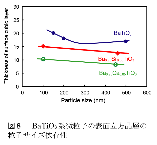 또한 이들 미립자에 대해 입자구조를 해석한 결과, 표면입방정층의 두께에 관해 그림8와 같은 결과를 얻었다. 즉, BST, BCT에서는 비교적 표면입방정층의 두께가 얇은 것을 알았다. 즉, Sr이나 Ca의 첨가와 같은 나노 입자를 제작할 수 있으면, 유전율이 향상할 가능성이 있다.