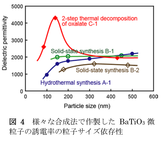 다양한 합성법으로 제작한 BaTiO3 미립자 준비 하여 유전율들을 측정하였다. 그림 4는 수열법(A-1), 고상법(B-1, B-2), 옥살산염의 2단계 열분해법(C-1)을 이용하여 제작한 BaTiO3 미립자의 유전율의 입자사이즈 의존성이다. A-1은 격자 내 OH기를 많이 포함하고, B-1은 결함 농도가 낮고, B-2는 Ba 결손이고, C-1은 불순물·결함 농도가 극히 낮은 것이 각각의 특징이다. 합성법 및 그에 따른 결함 농도에 의해, 유전율이 확연히 다른 것으로 나타났다. OH기 등 결함을 입자 내에 많이 포함하고 있는 수열법으로 제작한 미립자(A-1)의 유전율은 고상법으로 제작한 미립자(B-2)의 유전율보다도 작은 값이다. 또한 입자 사이즈의 감소와 함께 유전율이 감소한다. 한편 불순물이나 결함 농도가 극히 낮은 옥살산염의 2단계 열분해법으로 만든 미립자(C-1)는 유전율이 매우 크며, 100 nm 부근의 입자사이즈에서 유전율의 극대를 나타내는 것을 알았다. 또한 Ba 결손인 B-2는 다른 미립자들에 비해 유전율이 낮은 것으로 밝혀졌다.