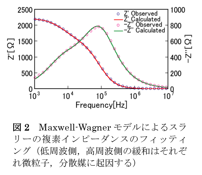 이 때, 슬러리의 상태는 미립자와 액체의 컴포지트라고 생각할 수 있으며, 슬러리의 복소 임피던스는 Maxwell Wagner 모델에서 근사해도 구할 수 있다. 따라서, 이 모델에서 슬러리의 복소 임피던스의 주파수 의존성을 해석하면, 미립자의 유전율이나 도전율을 결정하면, 미립자의 유전율을 결정할 수 있다. 그림 2는 해석한 모양이다. Maxwell-Wagner 계산식 중 미립자 유전율 도전율을 변수로서 슬러리의 복소 임피던스를 비선형 최소 2승 피팅하고, 미립자의 유전율이나 도전율을 결정하였다. 이 해석 소프트웨어의 개발·개량은 본 연구에서 행하였다.
