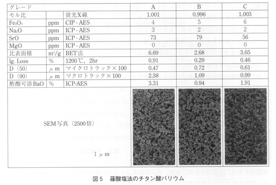 이상 고상반응법에 사용되는 탄산바륨의 제법과 얻어진 제품의 특징을 기술하였지만, 어느 제품에 있어서도 Sr이 불순물로써 혼입하고 있기 때문에 TiO2과의 반응에 의해 SrTiO3가 생성되어 BaTiO3에 고용해서 큐리점을 저온쪽으로 이동시키므로 Sr 함유량을 충분히 주의할 필요가 있다. 현재 구입 가능한 BaTiO3용 탄산바륨의 일람 표을 그림 1에 나타내었다.