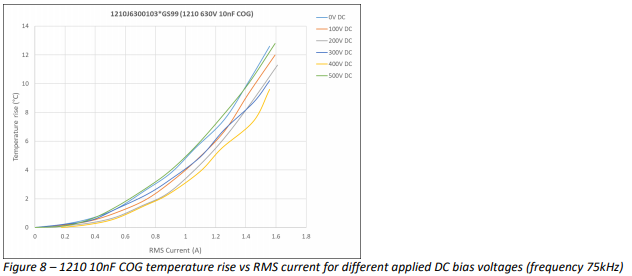 DC 바이어스가 0에서 증가하면 주어진 AC 전류에 의한 온도 상승이 점차 감소합니다. 이는 Bias가 유의한 영향을 미치지 않는 지점에 도달할 때까지 계속된다. 이를 1210(3225mm) 10nF COG 캐패시터에 대한 DC 바이어스의 효과를 보여주는 그림 8과 비교합니다.