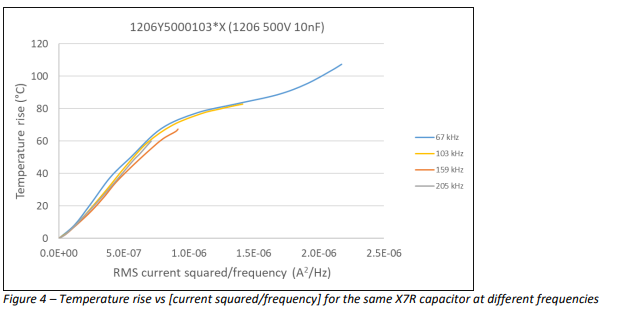사이즈와 용량을 선택하여 테스트한 결과, 적어도200kHz의 주파수에 대해 X7R 캐패시터의 초기 온도 상승은 다음 관계가 잘 맞는 것으로 확인되었습니다.