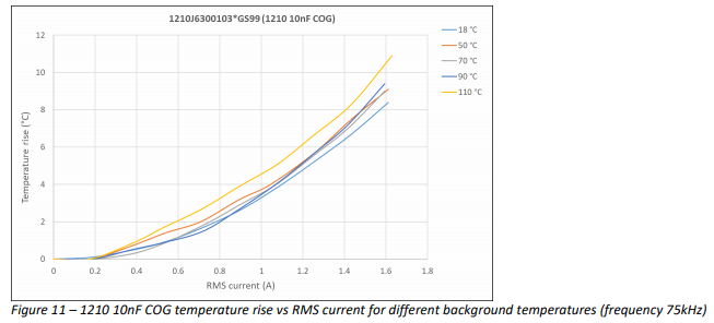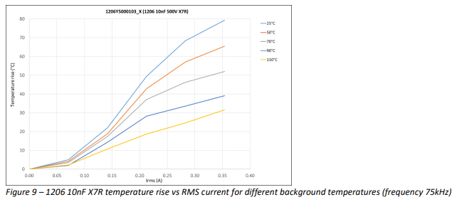 전력 변환기 시스템과 같은 고출력 애플리케이션에서 고주파 스위칭 회로에서 발생하는 열은 캐패시터를 둘러싼 백그라운드(또는 주변) 온도를 크게 증가시킬 수 있습니다. 이렇게 증가된 주변 온도는 AC 전류가 콘덴서를 통과할 때 콘덴서의 온도상승에 영향을 미칠 수 있습니다. 그림 9는 배경 온도가 1206(3216mm) 10nF X7R 캐패시터에 미치는 영향을 보여줍니다.