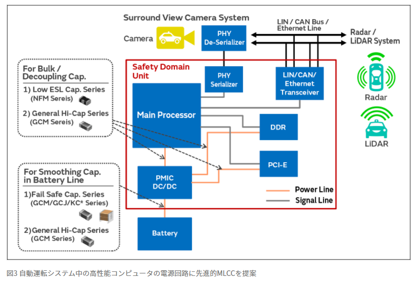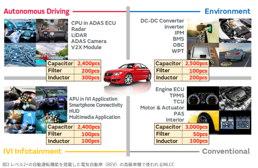 소형·대용량의 MLCC, 또 제어 IC 주변에서 사용하는 MLCC의 원수감소를 위한 저ESL MLCC의 요구가 높아질 것입니다).물론 자율주행 기능은 차량의 움직임을 제어하는 중요한 애플리케이션이기 때문에 신뢰성 높은 전장용 MLCC가 필수적입니다.