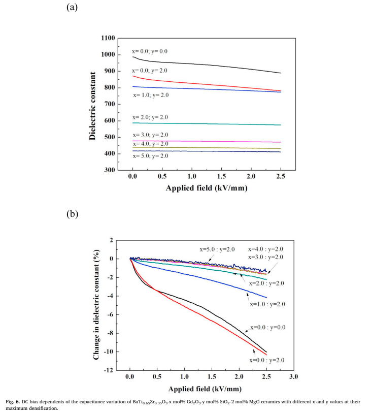 TCC는 온도에 대해 거의 직선적인 관계를 나타내며 Gd2O3 및 SiO2 함량이 증가함에 따라 시계 반대 방향으로 회전한다. BaTi0.65Zr0.35O3-2mol% MgO-2 mol% SiO2 세라믹은 실온에서 871의 유전 상수를 가졌으며, 5 mol% Gd2O3에서 417로 감소했다. 2mol% SiO2 첨가제를 포함하거나 포함하지 않는 BaTi0.65Zr0.35O3-2 mol% MgO 세라믹스의 유전 상수는 2.5 KV/mm의 바이어스하에서 10.2%까지 꾸준히 감소하였다. 유전 상수의 변화 크기는 5 mol% Gd2O3 첨가제의 경우 1.33%로 크게 감소하였다.